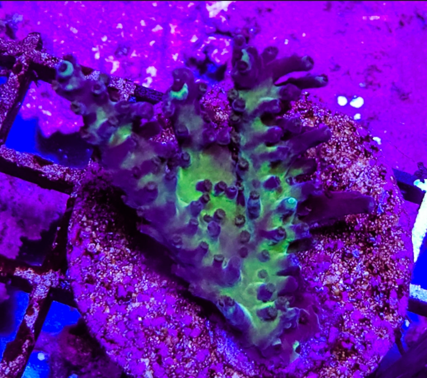 This is one of the more OG corals we have. Grown locally in our tanks for about 10 years originally coming from reef raft this is the Aussie gold. A gorgeous SPS with brilliant greens and purple tips with blue polyps. Grown and captivity for years making it slightly easier to care for than most SPS requires minimal to highlight and flow