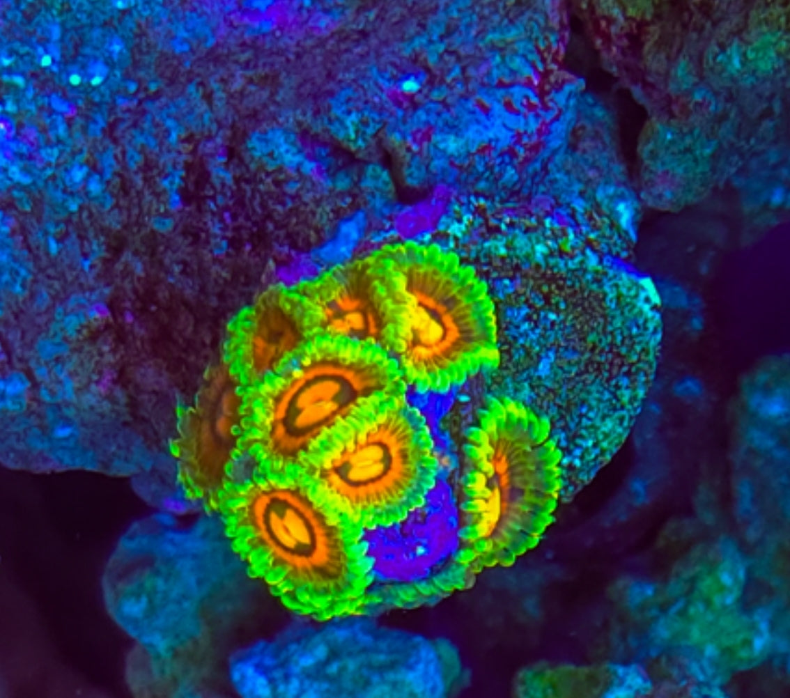 These are one of our favorite Zoa at the shop. With their intense neon green fingers black ring around the mouth then orange and incredible markings inside these are a true stunner and a gorgeous coral. Extremely easy to care for requiring minimal lighting and flow and can handle a lot of different tank parameters