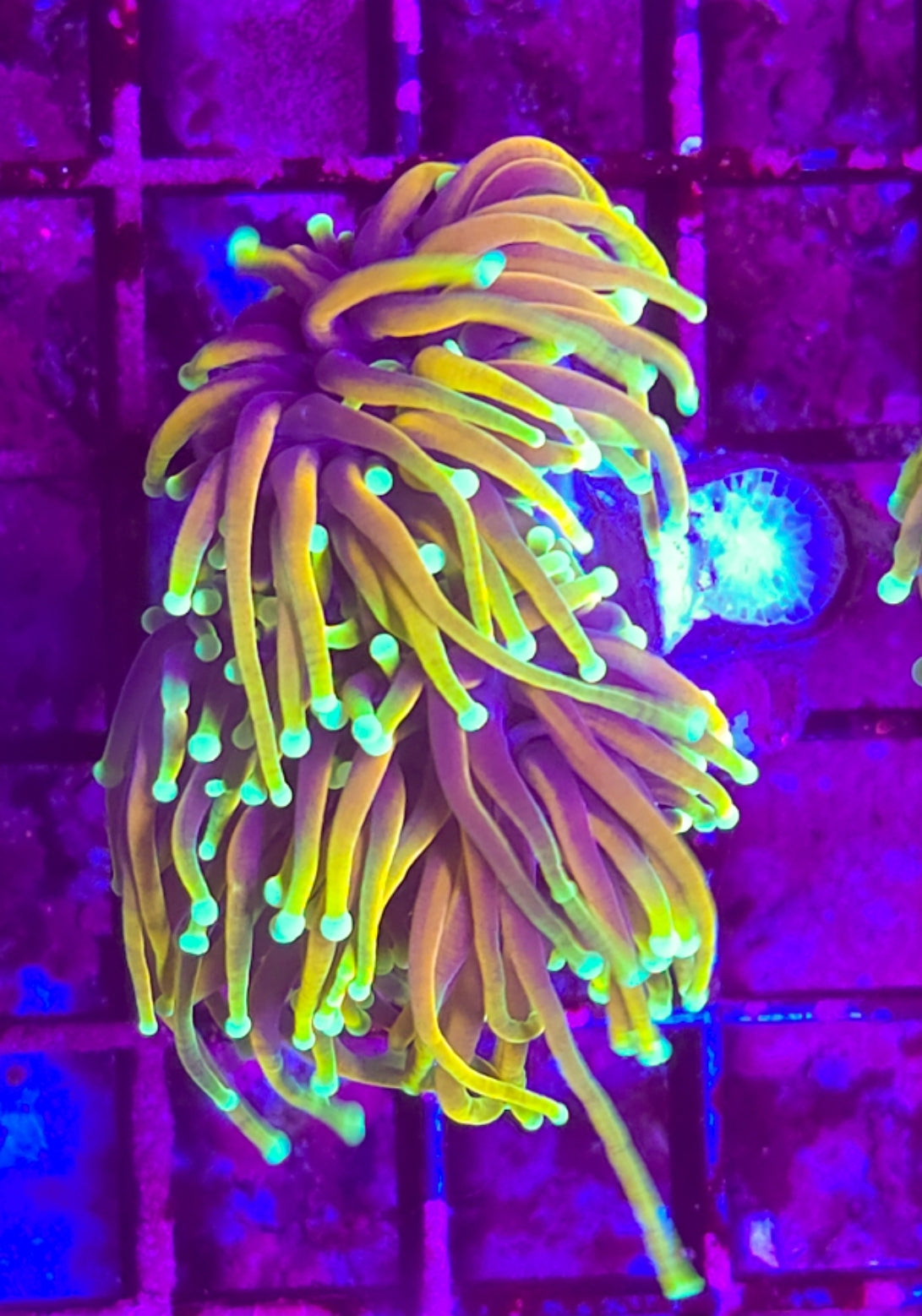 This is three heads of Hellfire Torch Coral. One of the most gorgeous of torches with its intense yellow and gold tentacles it's a true stunner. We keep them in moderate to high flow with highlighting