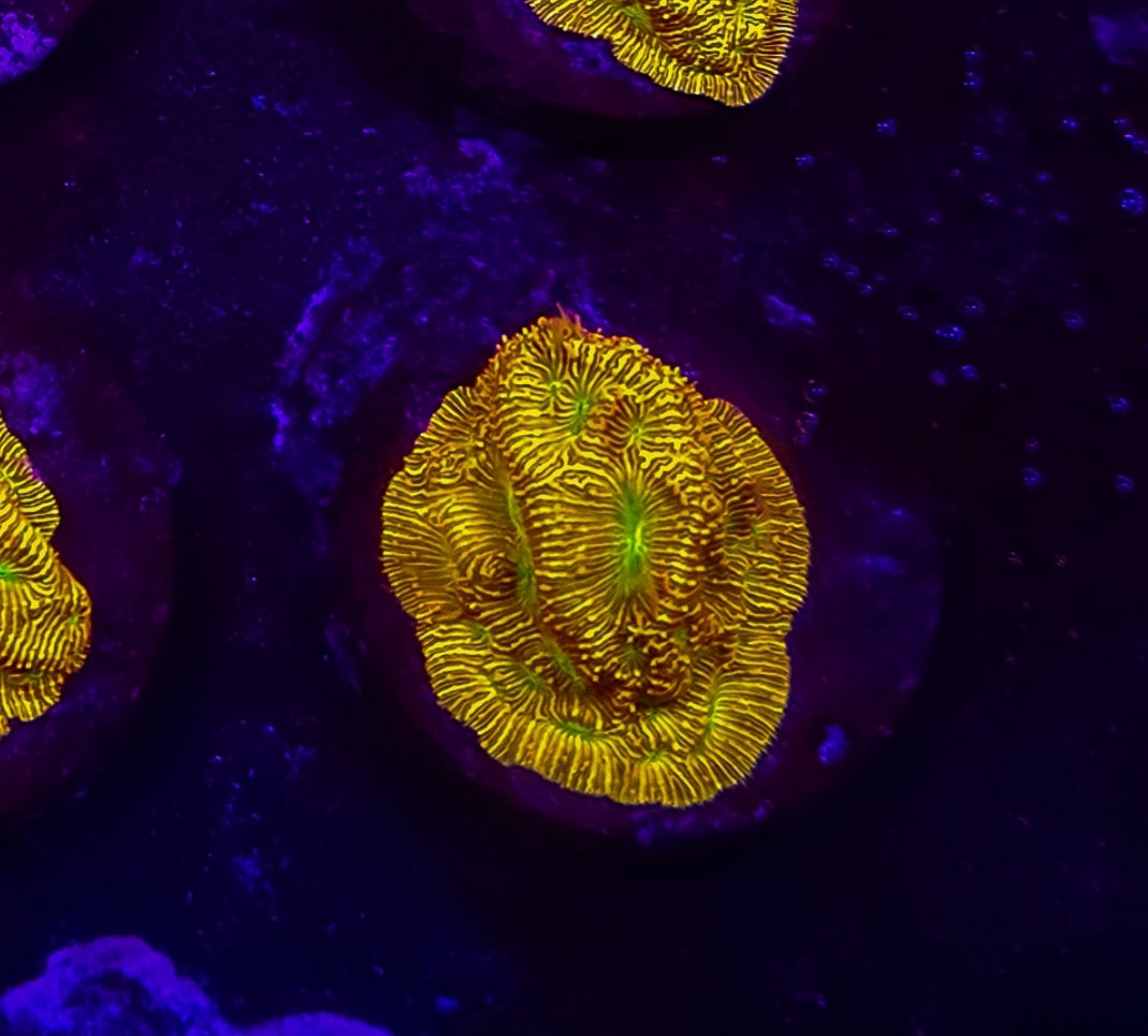 The jacko lantern lepto coral is a beautiful piece. With its ultra gold body and green eyes its easy to notice in any reef tank. Easy to care for requiring minimal lighting and flow.