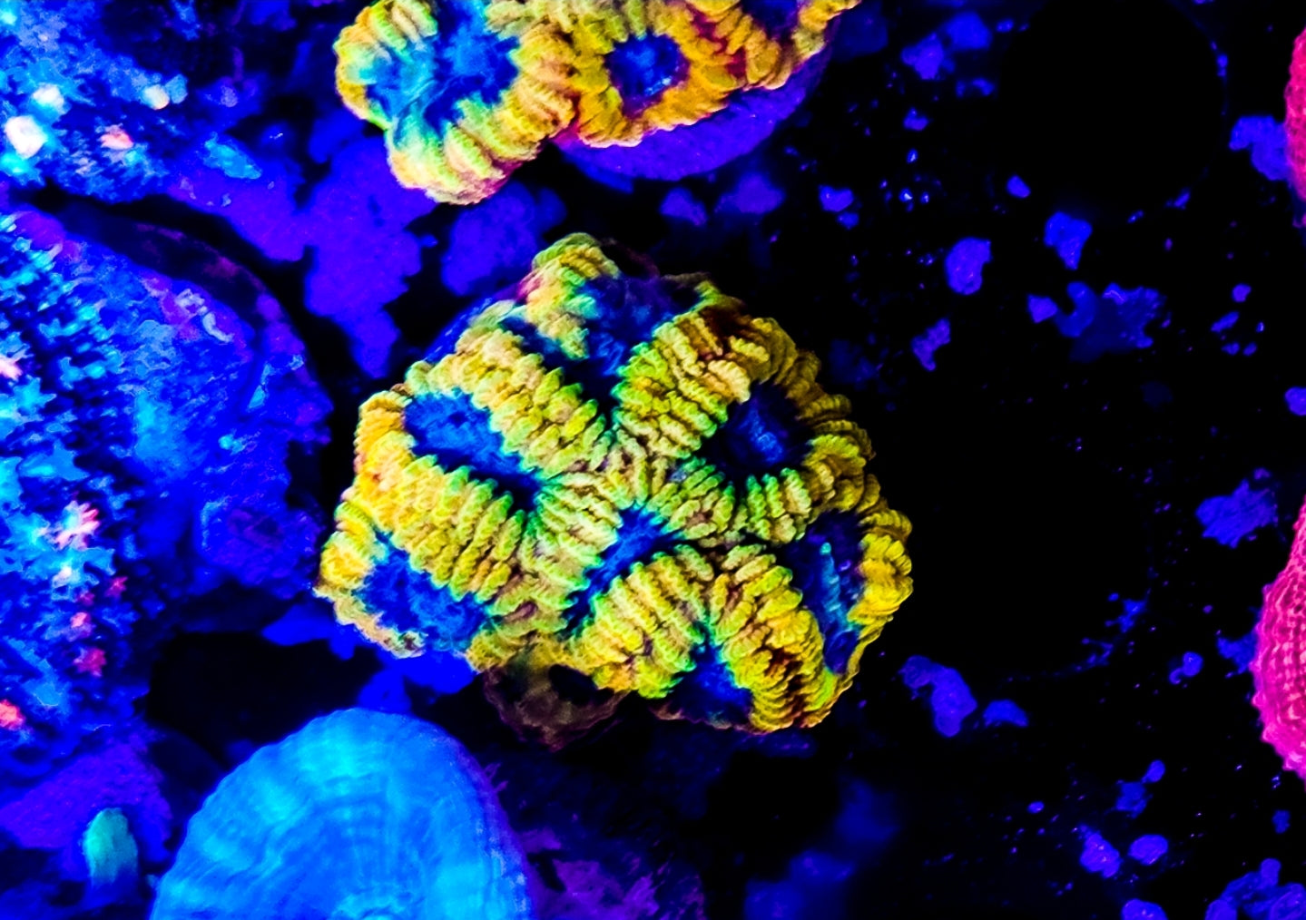 The JF Yellow Submarine Favia is a gorgeous Favia. With its intense yellow and orange outer and blue inner eyes it's a stunner. Easy to care for requiring minimal lighting and flow