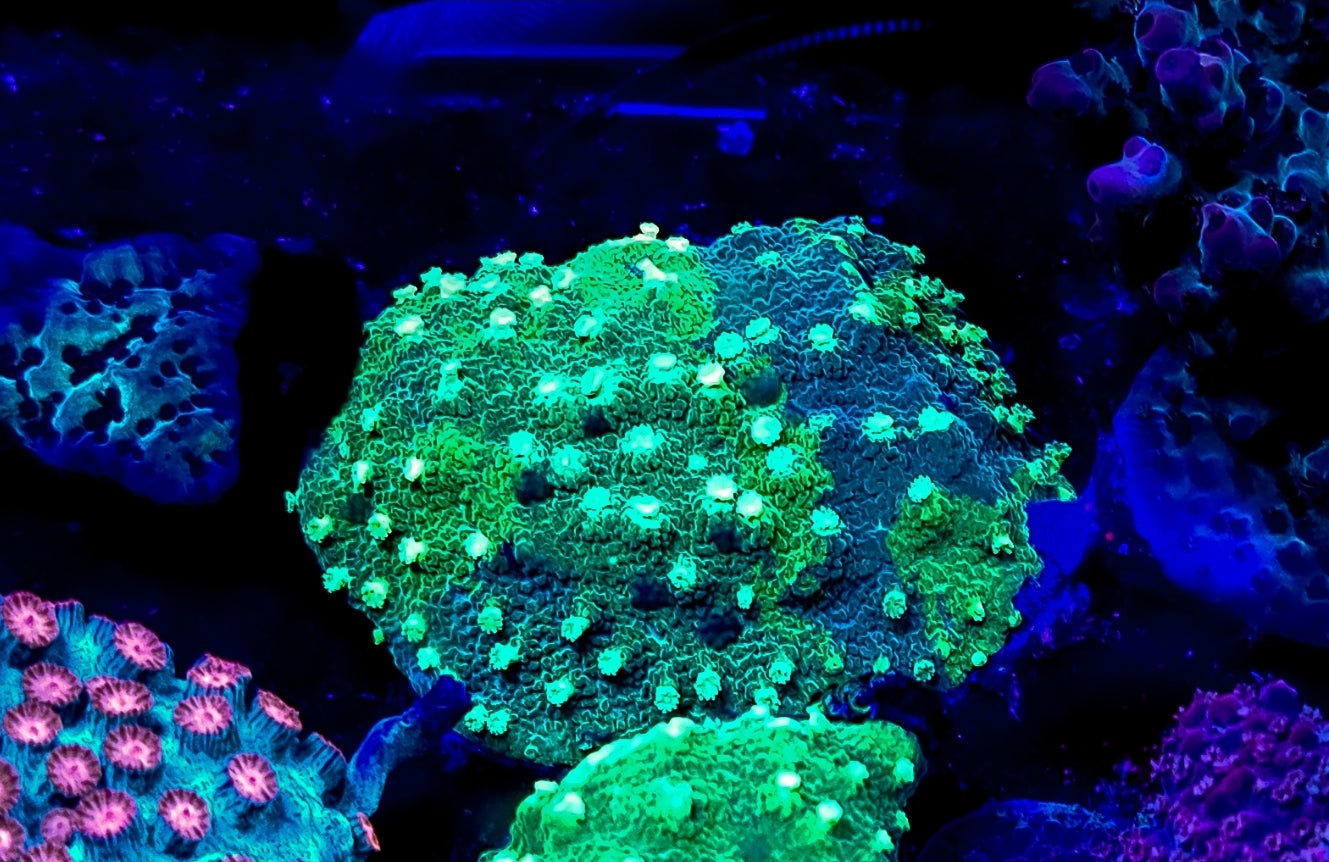 This is a gorgeous Kryptonite Cyphastrea with its dual colored greens and intense green polyps its a gorgeous coral for any reef tank. They like moderate to low flow and lighting.This coral is grown in our farm tank so for local pick up. Please call ahead to make sure it's at the shop