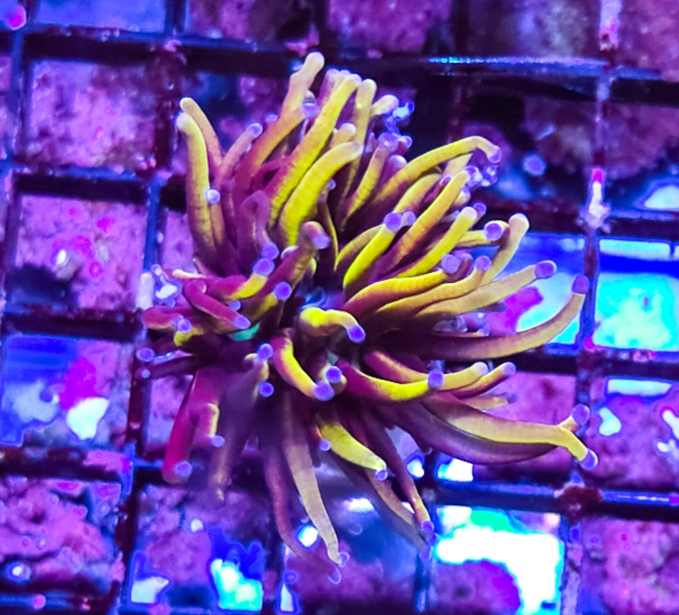 With their gorgeous purple,gold and blue tip tentacles with neon green mouth the New York Knick is a staple in the community for torches and a beautiful coral to add to your tank. They like moderate to high flow and lighting