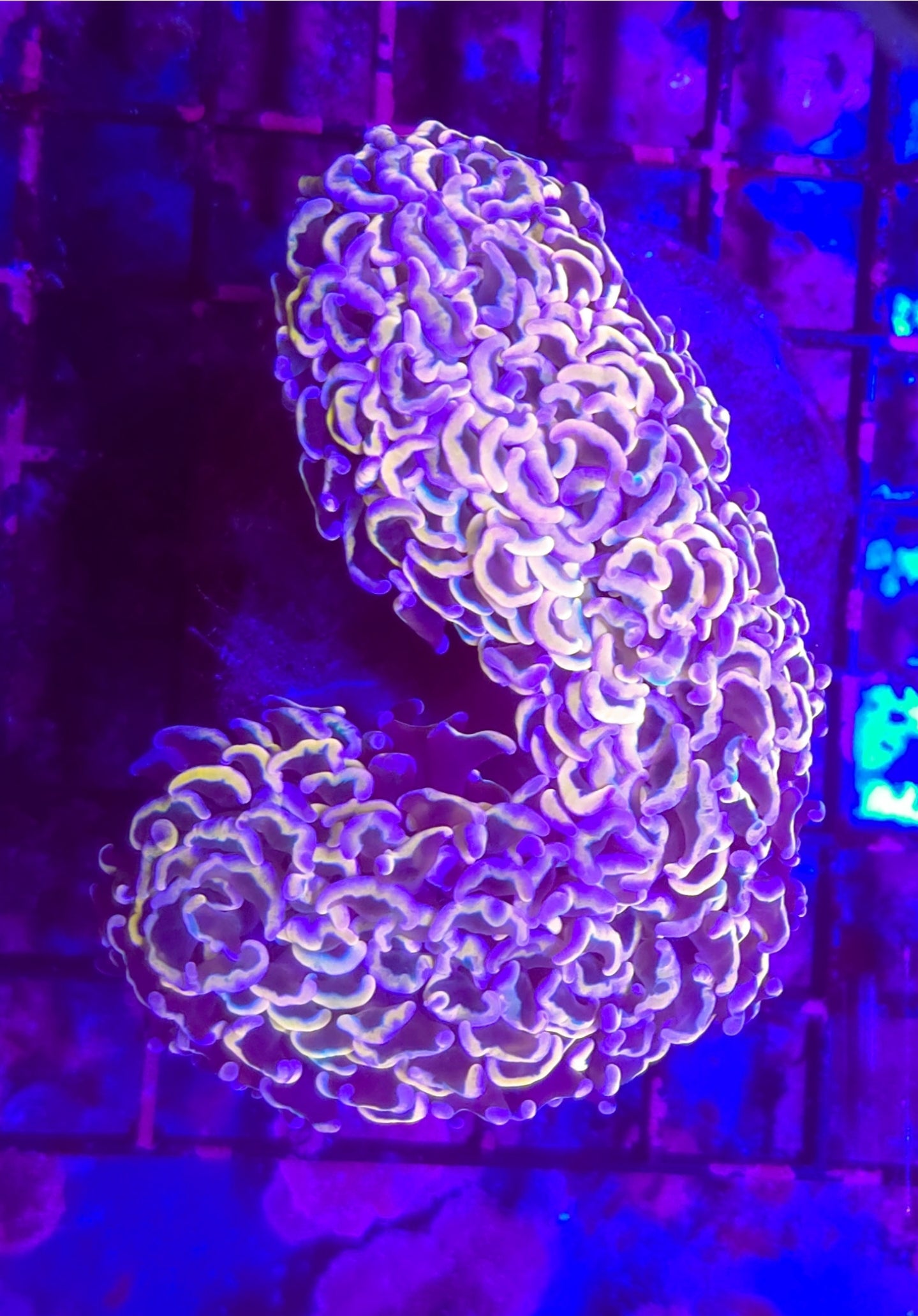 This is a gorgeous rainbow hammer wall coral. With this contrasting green pink blues and yellows it's a true stunner easy to keep requiring minimal flow and lighting