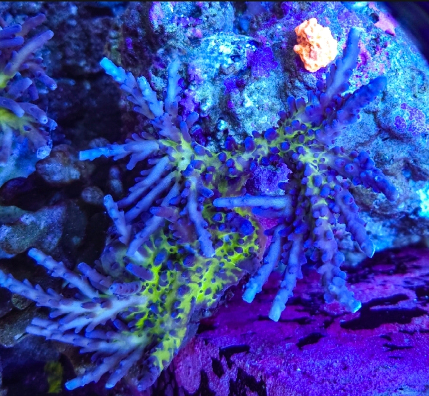 This is a gorgeous reef raft Aussie gold torte. This is tank grown in our system and one of the more beautiful corals with its hints of green yellow intense blue tips and neon blue polyps. Due to it being farmed for so long it does very well in home tanks and can handle a whole bunch of different types of lighting and flow