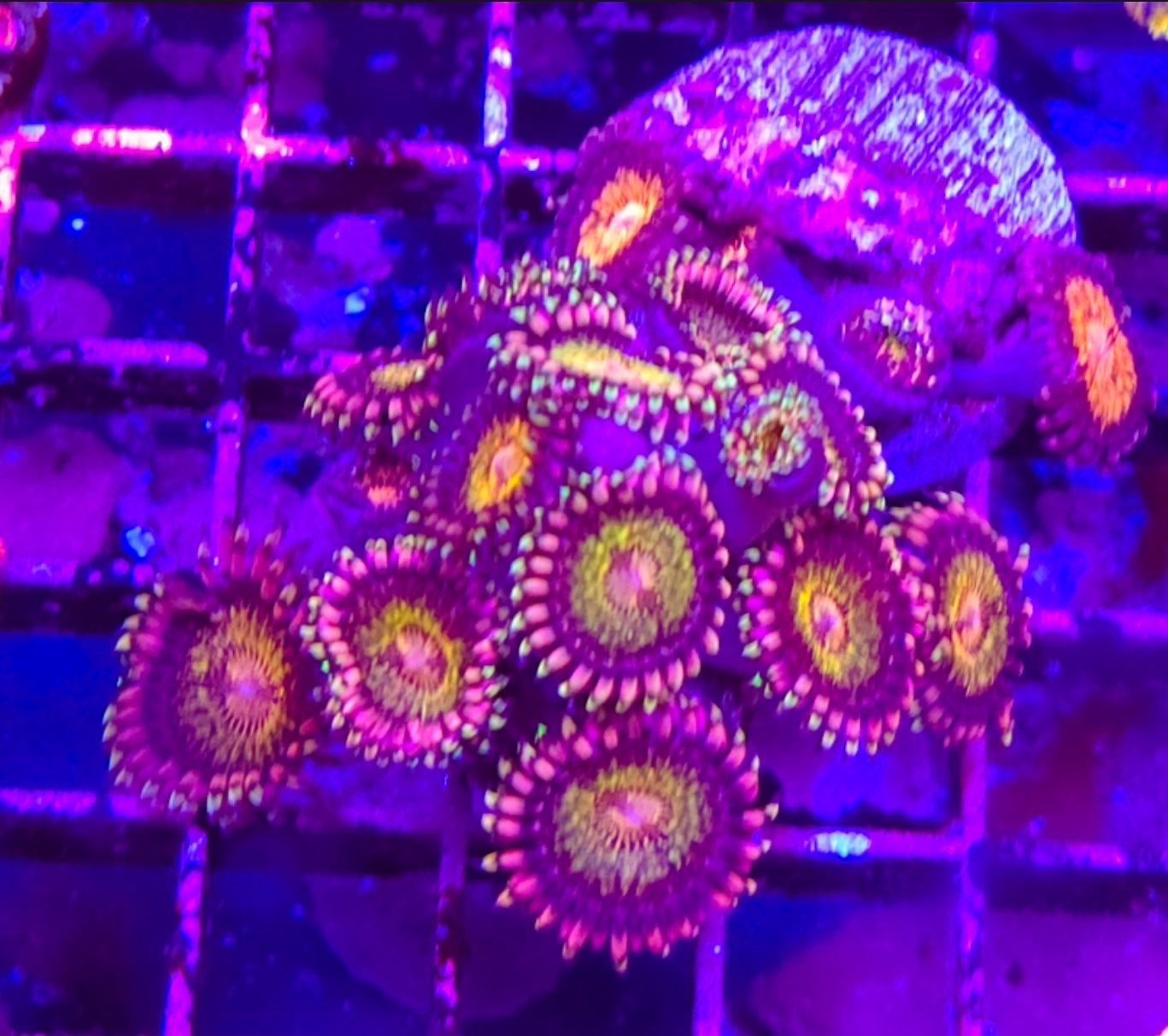 This is a colony of our SCC Firework's zoanthids. With a gorgeous explosion of color in the middle followed by intense pink polyps it's a true stunner great for any reef tank. Easy to care for requiring minimal flow and lighting making it a Great choice for an easier coral
