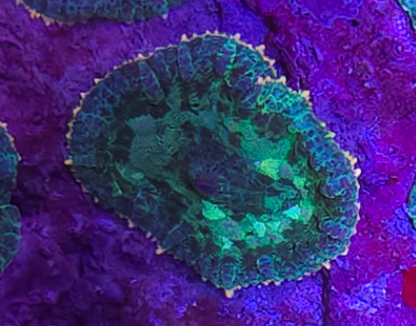 The magic carpet mushroom is beautiful with its blue green carpet-like appearance in color followed by neon pink tips it's a true stunner. Easy to care for requiring minimal flow and lighting