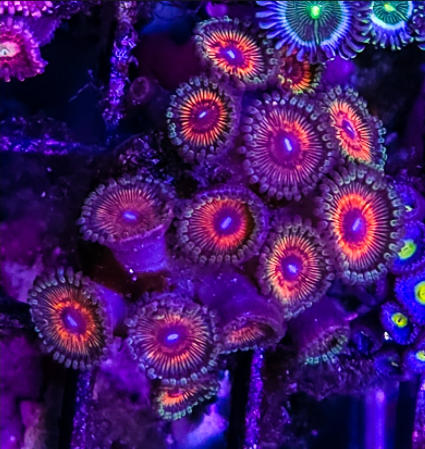 The rainbow fusions are gorgeous zoa with rainbow center and intense pop they're stunning. Easy to care for requiring minimal flow and lighting and can handle a host of water parameters making them great for any reef tank