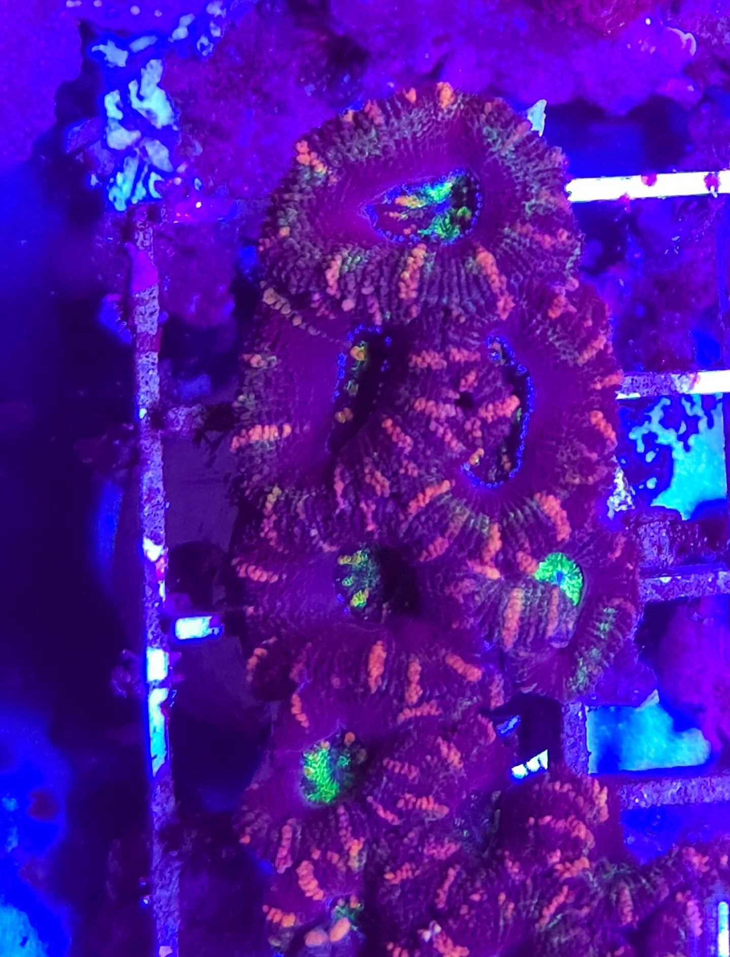 The Sweet Tooth acan is a beautiful coral. With its purple body red and pink bands and green center it's a true stunner great in any style reef tank. Easy to care for a requiring minimal flow and lighting can handle waters from dirty to clean
