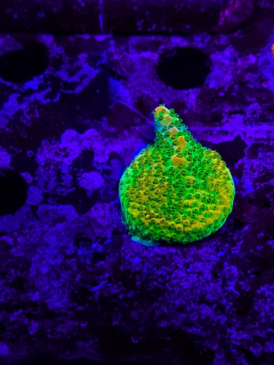 The tequila sunset is a truly bright acro with intense green and orange pop. It's sticks out like a sore thumb even with the lights off. It likes moderate to high flow and lighting.This coral is grown in our farm tanks so for local pick up please call ahead to make sure we have them at the shop.