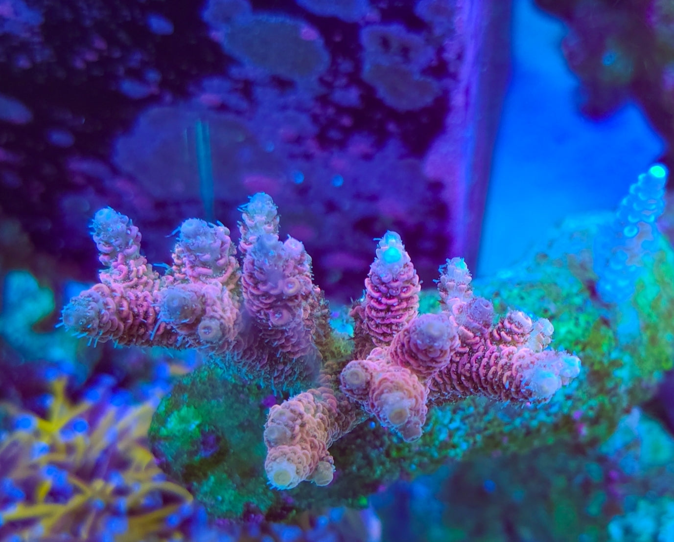 This is a gorgeous tank grown bubble gum Mille. With its beautiful pink base blue polyps and yellow foot it's a true stunner. It likes highlighting and high flow