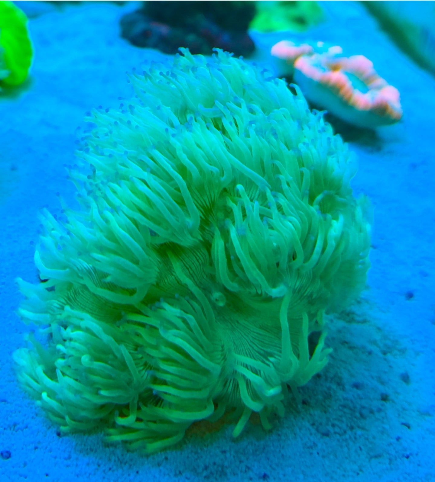 With its intense green body and neon blue tips this is a gorgeous elegance coral. Easy to care for requiring miniml flow and lighting making it great for any reef tank