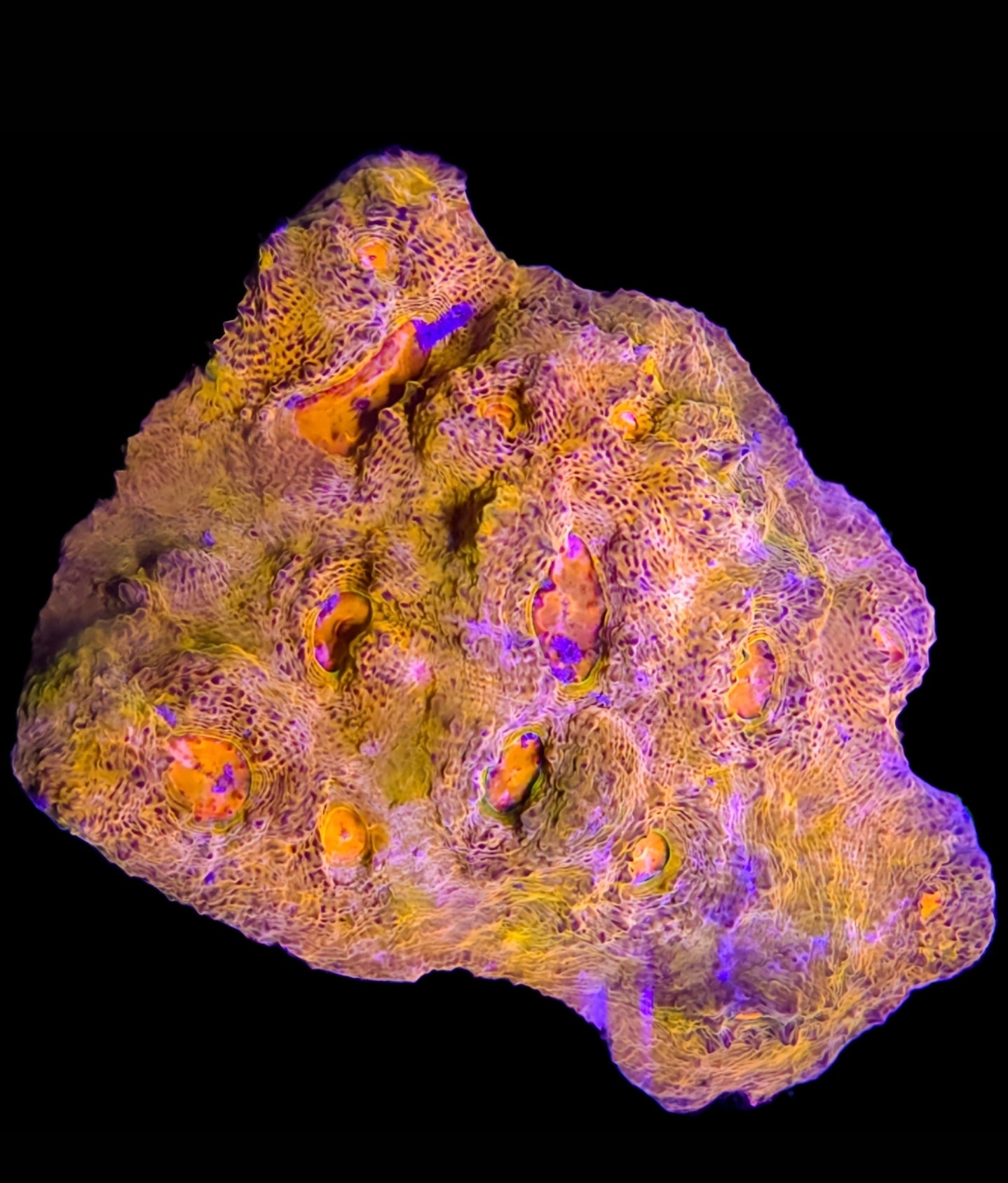 This is a gorgeous large chalice intense orange color with neon pink dots and lines all throughout it as well as hints of blue. Great for a showpiece medium to care for minimal lighting and flow
