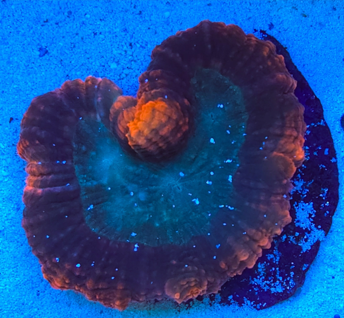 This is a gorgeous large lobo Coral. Easy to care for requiring minimal flow and lighting this one is quite beautiful with its green mouth purple and red body