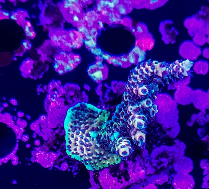 This is a gorgeous watermelon mille with its green and red body. It's a gorgeous coral great for any reef tank. It likes moderate to high flow and lighting